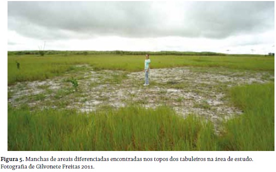 Nos topos aplainados dos tabuleiros, grandes manchas de areais de coloração branca a muito branca (figura 5) são encontradas com indicadores laboratoriais semelhantes (tabela 1). Tais manchas correspondem aos Espodossolos, considerados solos bem evoluídos, cuja gênese está relacionada à evolução morfotectônica do relevo, onde se evidencia soerguimentos de blocos, atestados pelas diferentes cotas altimétricas nos tabuleiros e pela drenagem assimétrica nas áreas adjacentes.