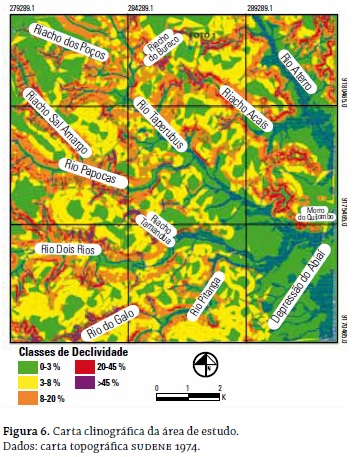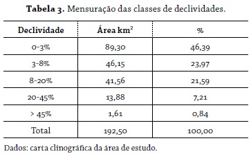 No que se refere à declividade, essa é expressa como a variação de altitude entre dois pontos do terreno, em relação a (nesse caso não se usa crase) distância que os separa; é de suma importância o seu conhecimento para o planejamento, tanto no que diz respeito ao cumprimento da legislação, como para garantir a eficiência e a eficácia das intervenções antrópicas no meio, a exemplo da substituição da vegetação natural pelo desenvolvimento da agricultura, especialmente da cana-de-açúcar, atividade que representa o motor econômico da área pesquisada. Com esse entendimento confeccionou-se a carta clinográfica (figura 6), que possibilitou balizar a área ocupada por cada classe (tabela 3).