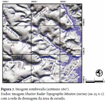 Por intermédio das duas cartas produzidas, tornou-se possível analisar a rede de drenagem e seu padrão (figura 7). Percebeu-se que os rios principais convergem para a Depressão do Abiaí e o padrão de drenagem dominante é o retangular, que, de acordo com Christofoletti "[...] resulta da influência exercida por falhas ou pelo sistema de juntas ou de diáclases e podem indicar controle estrutural e ação tectônica [...]" (1980, 105).