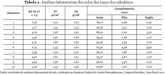 Salienta-se que a amostragem foi realizada na parte mais superficial, ou seja, no topo (horizonte O). Esses solos diferem-se bastante dos demais, tanto pela coloração, que varia de branca a muito branca, quanto pela textura. As análises de pH, densidade do solo, densidade das partículas granulométrica ou textural foram realizadas no laboratório de Análises de Solo e de Planta do Instituto Federal de Educação, Ciência e Tecnologia Sertão Pernambucano – IF Sertão – PE Campus Petrolina Zona Rural, de acordo com os métodos da EMBRAPA-CNPS (1997).