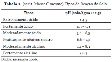 Por meio de análises laboratoriais realizadas em amostras de solo coletadas em sua maioria em topos de tabuleiros, em áreas distintas (figura 4), verificou-se que, quanto ao pH, todas as amostras comprovaram acidez, variando de fortemente ácido a moderadamente ácido, conforme as Classes de Reação do Solo elaboradas pela EMBRAPA-CNPS (2006) (tabela 2), atribuindo- se a formação desse solo por grãos de quartzo, como atestado na análise da densidade das partículas em que os resultados alternam entre 2,50 e 2,62 g/cm³, implicando em um solo mineral.