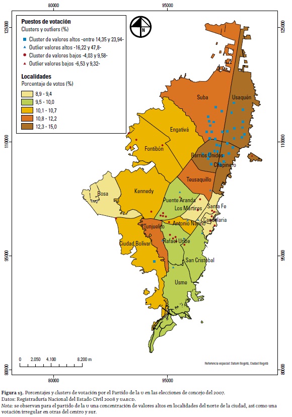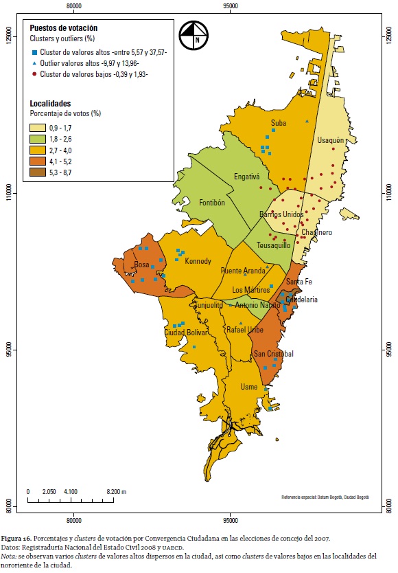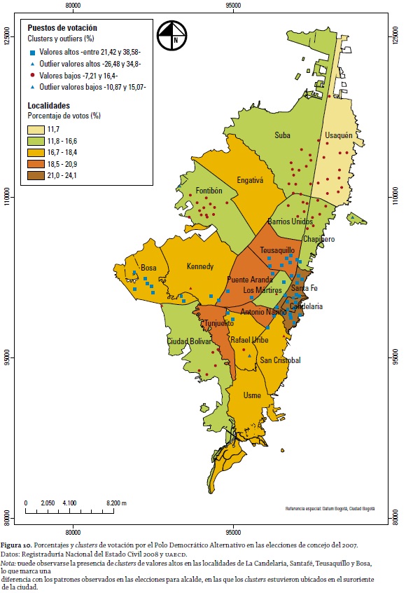 La votación más "clusterizada" fue la del Polo Democrático, con un valor de 0,2235. Los mejores resultados, a diferencia de las votaciones por el mismo partido para la alcaldía, se ubicaron en zonas de clase media (zona central de la ciudad), especialmente en las localidades de La Candelaria y Teusaquillo, aunque se mantuvo el rechazo de los estratos 5 y 6 (figura 10). También estuvieron concentradas las votaciones del movimiento religioso MIRA, con resultados especialmente favorables en algunos lugares de las localidades de Engativá, Kennedy, Antonio Nariño y Suba, lo que probablemente esté relacionado con las principales áreas de influencia de la iglesia que le sirve como base social (figura 11).