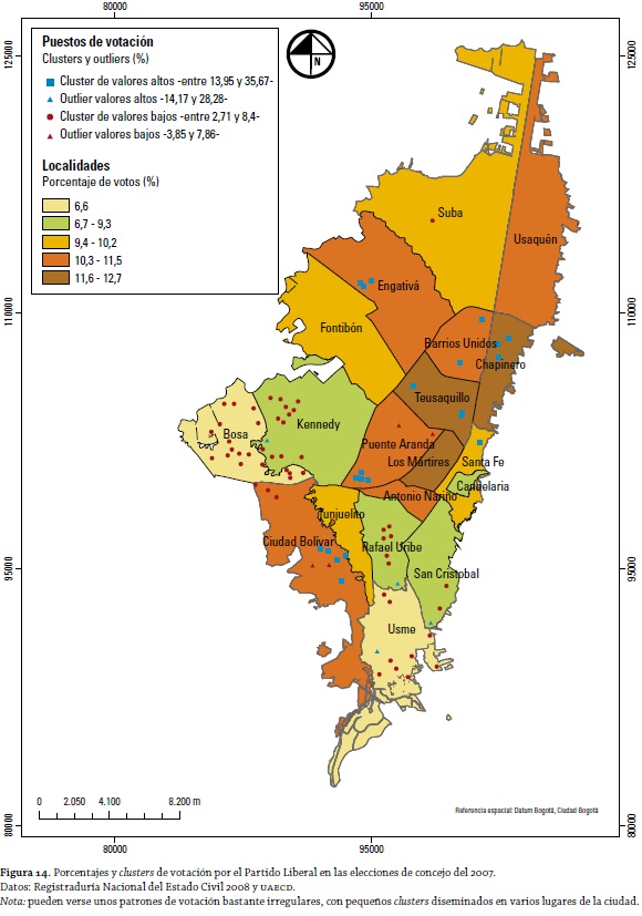 Probablemente, la autocorrelación relativamente alta de las votaciones para alcalde se deba a la existencia de un clivaje con una clara manifestación espacial: un mayor apoyo a la izquierda en las clases bajas y un claro apoyo a la derecha en las altas. Los patrones de apoyo a los dos principales candidatos parecen copiar la distribución espacial de la población por estratos, donde las clases bajas viven al sur y los estratos altos –5 y 6– en algunos lugares del norte de la ciudad –la mayoría de la localidad de Usaquén, una parte de la de Chapinero y una parte de Suba–.