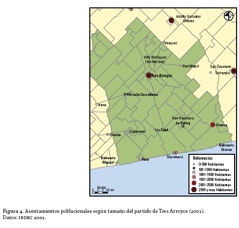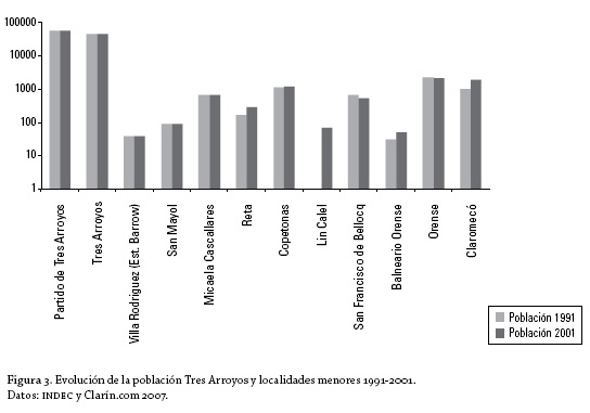 La figura 3 demuestra a nivel de las localidades la evolución de la población entre 1991 y el 2001, pudiendo agrupar los comportamientos en tres posibilidades: aquellas localidades con signos positivos, vinculadas al arribo de población (Tres Arroyos, Reta, Copetonas, Balneario Orense y Claromecó); las de signo negativo, con pérdida de población a lo largo del último período intercensal (Micaela Cascallares, San Francisco de Bellocq y Orense), y un conjunto de localidades estancadas con leve descenso (Villa Rodríguez [Estación Barrow] y San Mayol).