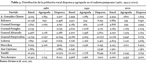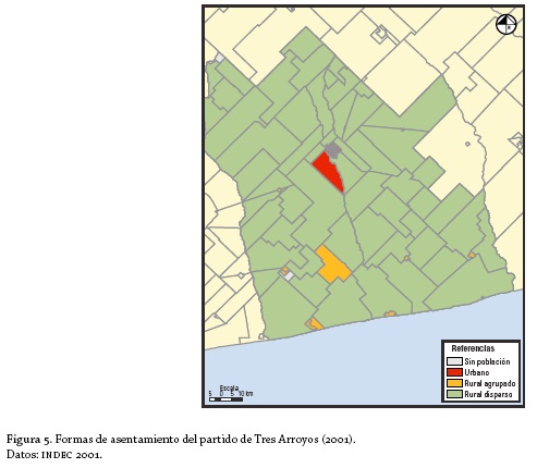 Sumado a la caracterización hasta aquí planteada, es posible reconstruir a partir del análisis y sistematización de los datos provenientes del censo del 2001 el modo de asentamiento, identificando a nivel territorial aquellas categorías que el INDEC define como urbanas, rurales agrupadas o rurales dispersas (figura 5).
