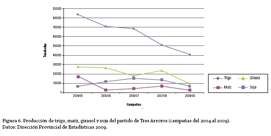 Históricamente el partido es reconocido en la literatura como polo agrícola, como ya se dijo, especialmente triguero, situación que se sostiene, según información procesada proveniente del Anuario 2009 de la Dirección Provincial de Estadísticas. No obstante, es notable, a pesar de su centralidad, el marcado descenso que habría tenido a partir de las campañas 2006-2007, cuando se incrementó la producción de maíz y girasol (figura 6).