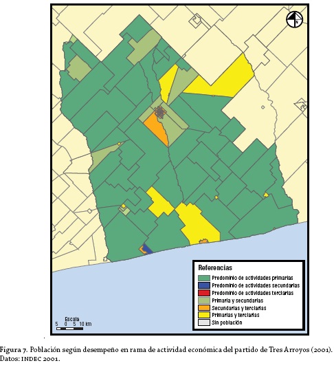 En estrecha vinculación con las formas de asentamiento y, por tanto, de apropiación del territorio deben mencionarse las actividades económicas presentes en el partido en estudio, cometido que es posible de abordar al analizar la dinámica de las ramas de actividad (figura 7). Como es de esperar, el sector primario concentra las mayores proporciones, aunque no es desestimable el papel del sector terciario y secundario, especialmente en cercanías de los grandes centros, los cuales dan indicios con respecto a la dinámica del partido, de los flujos de circulación y del tipo de prestaciones.
