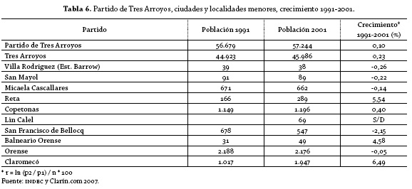 En términos generales, tal como puede observarse en la tabla 6, la ciudad cabecera del partido presenta una dinámica de signo positivo con respecto al crecimiento demográfico; situación que es acompañada por una serie de localidades menores (algunas con crecimiento, otras con decrecimiento) que concentran menos de 2.000 habitantes, límite establecido por el INDEC para distinguir lo urbano de lo rural en Argentina, como se explicó antes.