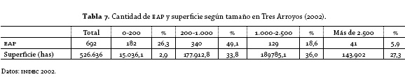 Desde este perfil productivo primario, es notable señalar, según el Censo Nacional Agropecuario del 2002, que el partido contaba con un total de 692 EAP, donde la mayoría de las unidades de producción se concentraban en el estrato de las 200 a las 1.000 has, y la mayor proporción de hectáreas correspondía al estrato que va de 1.000 a 2.500 has (tabla 7). Sin dejar de reflejar en la comparación entre 1988 y 2002 los mismos procesos que se ven para la República Argentina en su conjunto y para el sudeste de la provincia, Román y Gonzáles (2006) establecen que la cantidad de EAP se redujeron a nivel de partido en un 34%, con un incremento en la superficie media de las unidades, que pasó de 534 has a 761 has, pudiendo agregar que el modo de tenencia de la tierra también se vio modificado, ya que "[...] disminuyó la proporción de la superficie trabajada en forma exclusiva en propiedad [...] [y] aumentó significativamente la proporción de las explotaciones que combinan propiedad con distintas formas de toma de tierras (arrendamiento, aparcería y contratos accidentales) [...]" (Román y Gonzáles 2006, 43).