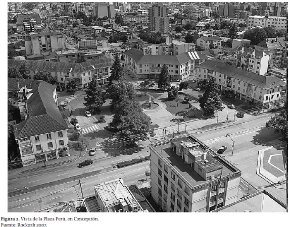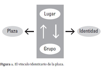 La plaza, en su definición asociada al agora y no tanto como proyector del poder, como ocurre en las plazas de armas de muchos lugares de América Latina o en las plazas centrales de Europa, se presenta como el resultado de un estrecho vínculo ente el grupo y el lugar. En esta visión, la plaza adquiere un carácter identitario que refleja el grado de participación y consenso ciudadano. En francés, justamente, el significado de lugar y así como el de de identidad están tan estrechamente ligados, que terminan por expresarse con la misma palabra "place". La plaza se convierte en el catalizador de la identidad, tanto impuesta por el poder sobre un nuevo espacio (Plaza de Armas) como resultado del consenso de sus habitantes (agora o foro). En ambos casos, se expresa el peso identitario de la plaza como causa o consecuencia de la interrelación del lugar con el grupo (figura 1). Para entender mejor la idea, puede retomarse el papel de muchas plazas periféricas, o vinculadas con las ferias, que se han establecido como lugares de encuentro para sus habitantes, al margen de la simbología del poder. En este caso, el objeto de estudio del presente artículo (la Plaza Perú en Concepción) es un ejemplo de plaza secundaria que va a establecerse como lugar por sus habitantes, al margen de las lógicas de poder de la plaza central de Concepción (Plaza Independencia).