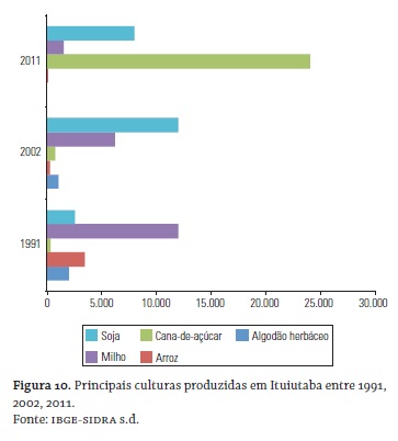Este gráfico revela ainda o aumento na produção da cana-de-açúcar, sendo que esta cultura na atualidade é detentora de grande produção em Ituiutaba e na sua MRG, concomitantemente ao aumento da área plantada de cana, têm-se a redução drástica da produção de outros importantes cultivos, destaca-se também a redução até mesmo da soja, e milho, já que estes outrora também foram detentores de grande produção agrícola, em toda a MRG de Ituiutaba.