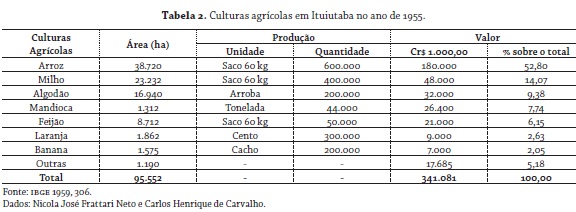 Para melhor compreensão da área plantada de arroz em Ituiutaba, produziu-se a tabela 2, nesta é possível visualizar as culturas agrícolas no ano de 1955, podendo observar a diferença entre o arroz e as demais culturas.