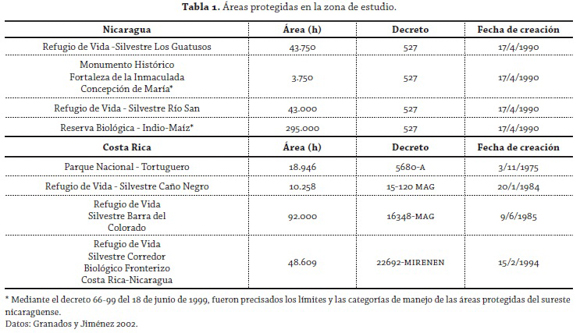 La reserva de biosfera en el sureste de Nicaragua se inició en el 2003 con la aprobación de la Unesco. Esta denominación ha obligado a conciliar en este territorio la conservación de la biodiversidad, la búsqueda del desarrollo económico y social y el mantenimiento de los valores culturales asociados; sobre la base de las recomendaciones y el cuadro estatutario surgido de la estrategia de Sevilla para el desarrollo de las reservas de la biósfera en el siglo XXI. La reserva de biósfera en el río San Juan incorpora 7 de las 76 áreas protegidas de Nicaragua: la reserva biológica Indio Maíz, las reservas naturales de Punta Gorda y Cerro Silva, el monumento nacional Archipiélago de Solentiname, el monumento histórico Fortaleza de la Inmaculada Concepción, los refugios de Vida Silvestre de río San Juan y Los Guatusos, estos dos últimos declarados humedales RAMSAR1 de importancia internacional. La nueva zonificación propuesta para este territorio aumentó su extensión desde los 7.650 km² que ocupaban las 7 áreas protegidas originarias, hasta los 18.340 km², al incorporarse áreas de amortiguamiento (52% del territorio) y de transición (28%), además de las zonas núcleo (20%) (Campos Barrantes et ál. 2010).