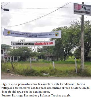 El departamento del Valle del Cauca ha propuesto la construcción de un acueducto regional que cubre entre otros municipios a Candelaria, el cual, según los diseños, deberátener la bocatoma y planta de potabilización en el municipio vecino de Florida. Sin embargo, sus habitantes no acceden a la realización de esta obra porque estiman que el agua es de su propiedad y el Departamento, al administrarla, se beneficiaría de las ventas del agua y nada le quedaría al municipio. Este hecho se presenta como el nodo conflictivo que impide la solución al problema de escasez social del agua en Candelaria (figura 4), cuando en realidad la problemática tiene que ver con la expansión territorial de los capitalistas cañeros y su dominio y control del agua y la tierra.