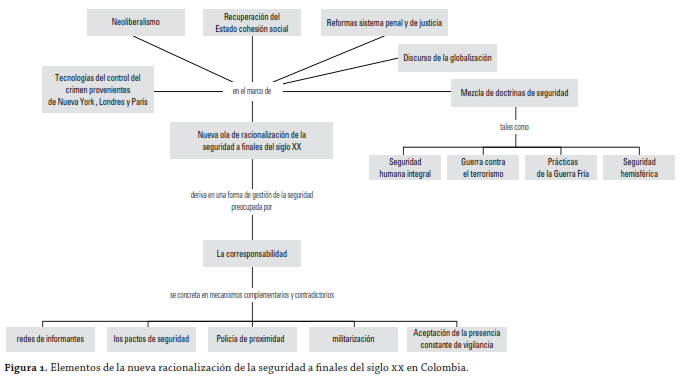 No obstante, se puede reconocer un principio de acción incorporado en la mayoría de dispositivos de seguridad. Este principio de acción es el de la 'corresponsabilidad', que se refiere a la cooperación e involucramiento directo de la población en la ejecución de las estrategias de seguridad y se concreta, en el caso colombiano, en políticas como las redes de informantes, los pactos de seguridad, la policía de proximidad y, en general, en la aceptación de la presencia constante de la vigilancia y en casos más extremos de la militarización. Este principio de la corresponsabilidad es altamente normalizador y disciplinario, en el sentido que exalta, como un valor cívico, patriótico, comunitario o social, la aprobación y la participación en la operación de los dispositivos de seguridad. La figura 1 resume estos elementos.