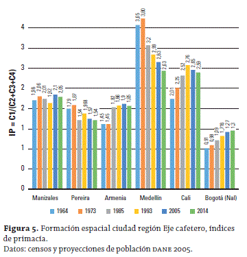 Un indicador de condiciones de desigualdad de peso y dimensión entre las entidades territoriales de la formación espacial, que guarda relación con el principio de rango–tamaño, es el de primacía. El índice de primacía es fundamentalmente un indicador de la capacidad de concentración de población de la ciudad principal de un país o región y una de las posibilidades de cálculo es estimar cuántas veces caben las tres ciudades siguientes en la ciudad de mayor tamaño. En la figura 5 se incluyen los cálculos de este índice para las ciudades capitales de la formación espacial, Medellín y Cali frente a su respectivo departamento, al igual que el de Bogotá respecto al país, en el periodo 1964–2014.