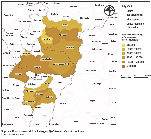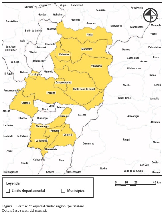 En el Eje Cafetero colombiano se ha argumentado sobre la existencia de una formación espacial de escala urbano regional en lo que se ha denominado la "Ciudad región Eje Cafetero" (figura 1). Para su definición se ha argüido la presencia de diferentes escalas de urbanización que van desde el nivel de conurbaciones como Manizales–Villamaría, Pereira–Dosquebradas y Armenia– Calarcá, a zonas con procesos de metropolización que se dan alrededor de las tres capitales de departamento, las cuales se articulan a lo largo de un corredor urbano regional que se consolida con la Autopista del Café. En ese sentido, los municipios identificados son Manizales, Chinchiná, Villamaría, Palestina y Neira, del departamento de Caldas; Pereira, La Virginia, Dosquebradas y Santa Rosa de Cabal, de Risaralda; Cartago, del Valle del Cauca; y Armenia, Calarcá, Circasia, La Tebaida y Montenegro, del Quindío (Rodríguez Pérez y Arango 2004; Rodríguez Pérez et ál. 2002).