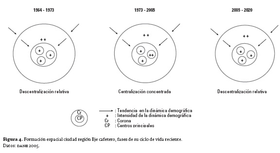 De acuerdo con las proyecciones del DANE, entre 2005 y 2020 las poblaciones de la corona tienden a variar a una tasa superior a la de los centros (0,79% frente a 0,51%), a la vez que se desacelera el crecimiento demográfico de Pereira y tiende a converger a las dinámicas de los otros centros (una tasa de 0,57% frente a 0,55% y 0,44% de Armenia y Manizales). Es posiblemente el inicio de un proceso de descentralización relativa, en el que la corona se expande con una dinámica mayor a la de los centros principales y la formación espacial en su conjunto, y es relativa en cuanto los centros siguen creciendo. En la figura 4 se esquematizan estas fases del ciclo de vida reciente de la formación espacial.