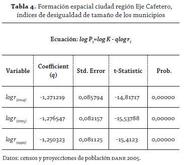 El índice de desigualdad de tamaño de las ciudades (q) se estimó por mínimos cuadrados ordinarios utilizando información sobre población y rango en los años 1990, 2005 y 2014, se encontró que su valor absoluto aumenta levemente entre 1990 y 2014 aproximándose a 1,27 (tabla 4), cercano al comportamiento de los sistemas urbanos contemporáneos que fluctúa entre 0,7 y 1,3 (Pumain y Saint–Julien 2014). En ello se evidencia una mayor igualdad de peso y dimensión entre los municipios de la formación espacial; especialmente por la existencia de tres centros principales, a la vez que la presencia de un proceso de descentralización relativa en el que el conjunto de municipios de la corona se expande con una dinámica superior a la de dichos centros.