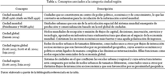Existen claras diferencias entre las categorías ciudad región, ciudad global y ciudad región global. La ciudad región hace referencia a un territorio producto de las relaciones que se establecen entre sus nodos urbanos; la ciudad global se centra en las relaciones transfronterizas, por lo que es una formación espacial que no depende de estructuras regionales en las que la ciudad se inserte; la ciudad región global, al tiempo que destaca esas estructuras regionales, tiene un enfoque menos limitado por las fronteras geográficas y considera los vínculos que se establecen con otras regiones a través de las redes globales. En la tabla 1 se describen estas y otras categorías asociadas.