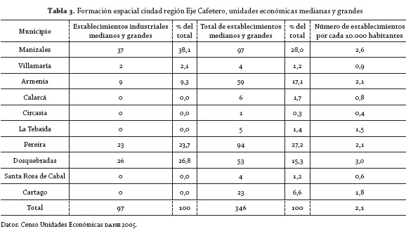 La información sobre unidades económicas coincide con la identificación anterior de los centros principales de la formación espacial ciudad región Eje Cafetero, especialmente si se considera un umbral de densidad como el número de establecimientos por cada 10.000 habitantes (tabla 3). Ella sirve para evidenciar la presencia de dos hechos novedosos en el análisis de esta configuración espacial. De un lado, es evidente la concentración de la actividad económica del conglomerado de Manizales en su núcleo principal, lo que sumado al escaso desarrollo funcional de los demás municipios evidencia una especial polarización de las oportunidades económicas en esta capital.