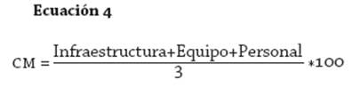 Para la medición de la CM, se tomaron en cuenta tres variables: personal, infraestructura y equipamiento, valoradas por su cantidad, estado, localización y funcionalidad (ecuación 4).