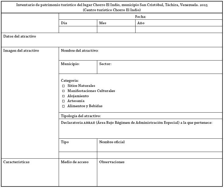 Otro parámetro previamente establecido fue la identificación de los sitios prestadores de servicios y sus medidas planimétricas. Esta fase comprendió una recolección de datos que se centró en el levantamiento de coordenadas de longitud (X) y latitud (Y) y de un trazado y cálculo de un vector lineal sobre la sección de carretera del área conocida como Chorro El Indio por medio de un GPS marca Garmin1. A esto se le suma un reconocimiento general donde fue aplicada una ficha de levantamiento de atributos de los sitios prestadores de servicios encontrados (anexo 1); además, se realizaron diversas actividades de campo durante octubre y noviembre del 2014 para la obtención de los datos.