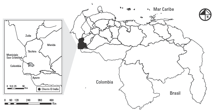 El área de estudio se encuentra localizada en las coordenadas 7°43’10’’ latitud norte y 72°11’13’’ longitud oeste, dentro del Parque Nacional Chorro El Indio, específicamente en la Sierra La Maravilla, una cadena montañosa alargada paralela al curso del río Torbes, que actúa como divisoria de aguas entre las cuencas de los ríos Torbes y Uribante (Badillo y Vásquez 2000). En dicho sistema montañoso tiene su nacimiento la cascada Chorro El Indio, de 35 metros de altura, la cual atraviesa la carretera San Cristóbal - Macanillo, al caer desde los 1.140 m.s.n.m., este cauce -al igual que otros de la misma vertiente- es utilizado para el abastecimiento de acueductos rurales (Badillo y Vásquez 2000; Pulido 2007). Es en los alrededores de este salto de agua natural, donde se encuentra ubicada el área de actividades turísticas. Desde el punto de vista político administrativo, pertenece al municipio San Cristóbal del estado Táchira (figuras 1 y 2).