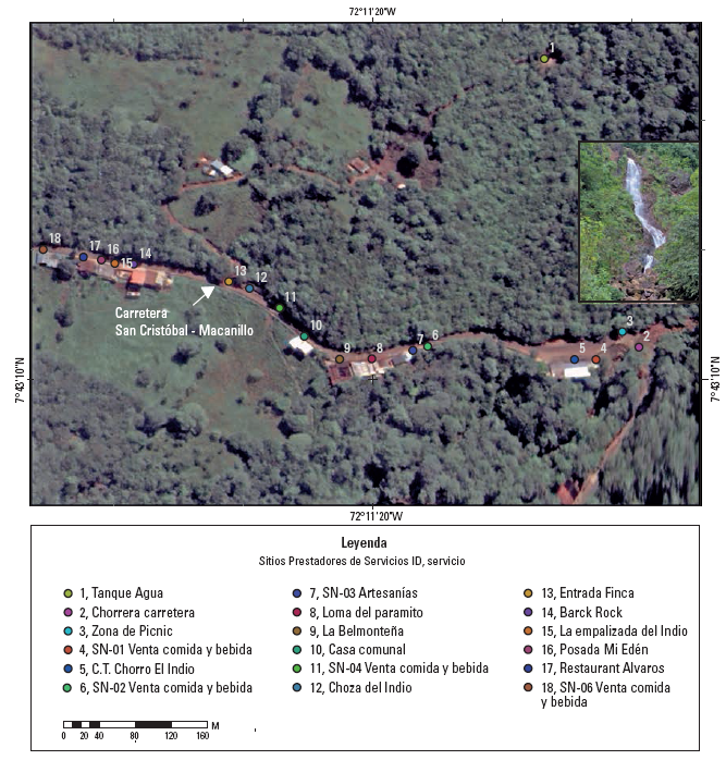 Otro aspecto importante a destacar es la georreferenciación del inventario de los lugares turísticos en la zona estudiada, ya que con la utilización de la imagen satelital Quick Bird se hizo posible ubicar diversos sitios y elementos que conforman el sendero del Chorro El Indio.