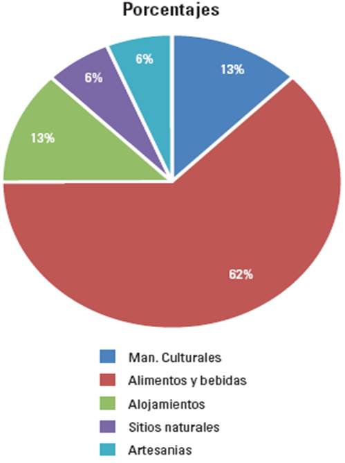 Sumado al análisis de capacidad de carga, el inventario de los sitios prestadores de servicios permitió observar que el mayor porcentaje de estos está reflejado en los sitios que ofertan “comida y bebidas típicas” con un 62,5%, seguido por “alojamiento”, “manifestaciones culturales” y “sitios naturales” con un 12,5% cada una, por su parte la venta de “artesanía” representa un 6,2% (figura 4). Los resultados denotan debilidad en la casi ausencia de alojamiento y artesanías, principalmente.