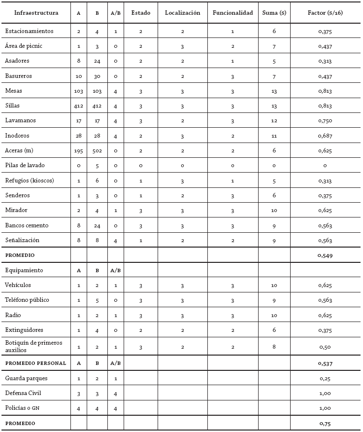El estado, por otra parte, se evaluó con base en las condiciones de conservación y uso de cada componente, tales como su mantenimiento, limpieza y seguridad. La localización se evaluó en razón de la ubicación y distribución apropiada de los componentes y la facilidad de acceso a los mismos. La funcionalidad, por otra parte, es la utilidad práctica que tiene un determinado componente para el personal o los visitantes, por lo tanto, la funcionalidad es el resultado de una combinación entre el estado y la localización de la infraestructura o equipo (Cifuentes 1999) (tabla 2).