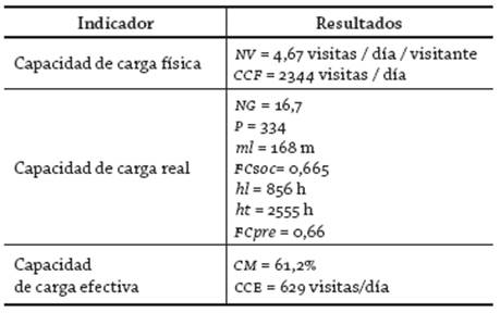 La CCE calculada para el sitio turístico Chorro El Indio fue de 629 visitas/día, lo cual representa un 26,8% de la capacidad de carga física del área. Resultados previos para obtener la CCE se encuentran reflejados en la tabla 3.