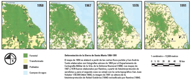 Figura 2 Proceso de deforestación en la región de Los Tuxtlas y la Sierra de Santa Marta (1958-1991). Datos: elaborado a partir de Blanco 2006, 282.