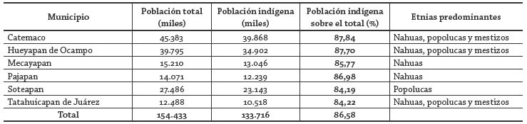Dentro de la región de Los Tuxtlas en la Sierra de Santa Marta, los datos censales permiten apreciar el predominio de la población de autoadscripción indígena respecto del total demográfico municipal. En los seis municipios tuxtecos y serranos esta población originaria -que convive junto a población mestiza- representa más del 84% (tabla 1).