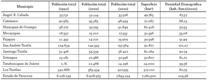 Tabla 3 Municipios, población (1990, 2000 y 2010), superficie y densidad demográfica (2010) en la Reserva de la Biosfera de Los Tuxtlas