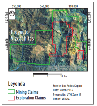 Es en este contexto andino de la cuenca del río Putaendo, provincia de San Felipe, región de Valparaíso, donde se han desarrollado 162 sondajes de prospección minera, los que suman un poco más de 45.000 metros de perforación (Los Andes Copper Ltda. 2016). La compañía dueña de los terrenos y encargada de las prospecciones y del posterior desarrollo del proyecto minero es la firma canadiense Los Andes Copper Ltda. Según ella, el proyecto minero Vizcachitas tendría una vida útil de 28 años, que serán sustentados en la explotación de 8,5 millones de libras de cobre y 281 millones de libras de molibdeno, a un precio de US$2.75 libra y US$13.62 libra, respectivamente, estimando gastos iniciales que bordearían los US$2.900 millones de dólares. Por su parte, la Comisión Chilena del Cobre (COCHILCO 2016), ha realizado exitosos sondajes y exploraciones en esta área, la que se ubica dentro de la franja metalogénica de la cordillera de los Andes comprendida entre los 32o y 34o de latitud Sur. Esta ha sido catalogada como el segundo cinturón de yacimientos más importantes del país, con pórfidos de cobre de clase mundial. En términos de competitividad, el proyecto Vizcachitas se ubica en la misma franja metalogénica de yacimientos como El Teniente, Los Bronces-Río Blanco o Los Pelambres. Por ello, Andes Copper se considera un proyecto minero que “crece en tierra de gigantes” (Minería Chilena 2008). El área de exploración y explotación minera alcanza los 250 km2, de los cuales solo se han sondeado de manera significativa 9 km2(Los Andes Copper Ltda, 2016).