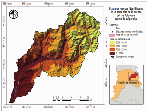 La cuenca del río Putaendo tiene una extensión de 1.192 km2 y una longitud de 85 km (Dirección General de Aguas 2004). Su nacimiento es resultado de la confluencia del río Rocín desde el este y el Estero Chalaco desde el noroeste, a una altitud de 1.218 m.s.n.m. El río Putaendo es uno de los tributarios más significativos del río Aconcagua, afluente de importancia determinante para la cuenca, pues drena un área de unos 7.163 km2 (45% de la Región de Valparaíso), sustentando la demanda de riego, industria, minería y uso doméstico, que supera los 500 millones de m3 de agua al año, principalmente en la zona media e inferior del valle donde habita casi el 30% de la población regional (Martínez, Fernández y Rubio 2012). Las actividades productivas que se desarrollan en los valles del semiárido y la supervivencia de los modos de vida y la cultura dependen de la provisión de agua y, por tanto, de las dinámicas hídricas que ocurren en la alta montaña, por lo que las actividades que afectan o degradan glaciares rocosos poseen un notable componente social.