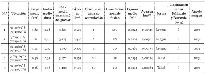 Nota: * Calculado con base en la relación empírica de Espesor Medio, formulada por Chen y Ohmura (1990). La fórmula, de características conservadoras, ha sido validada con sondeos sísmicos en 63 glaciares de montaña de los Alpes y su aplicación ha sido parte de los estudios de Azócar y Brenning (2010), Brenning (2005), Ferrando (2012), Torres, Brenning y García (2013) y Segovia (2015). Fórmula de Espesor Medio: espesor (m) = 28,5 (área en km2)0,357