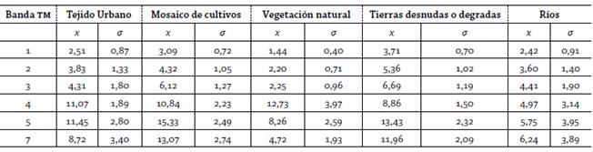 Los valores de corrección geométrica fueron de 0,335, 0,478 y 0,421 pixeles para las imágenes de 1987, 2001 y 2010, respectivamente, con errores de 10,04, 14,33 y 12,62 m. Los valores medios de las tendencias espectrales presentan un comportamiento similar en cada tipo de cobertura, tejido urbano, mosaico de cultivos, tierras desnudas o degradadas y ríos (figura 2). Los ríos se diferencian de las demás en los valores que corresponden a las bandas del infrarrojo. Únicamente la vegetación natural mostró diferencias en los valores medios con respecto a las otras categorías (tabla 1).