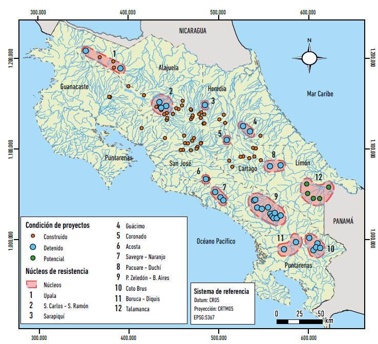 Asimismo, a partir de dicha sistematización, se identificaron doce núcleos de resistencias comunales en defensa de los ríos, organizados en función de un criterio tanto geográfico como político-organizativo. En cuanto a la variable temporal, la gran mayoría de estos han sido en las últimas dos décadas, a excepción de los dos casos "históricos" ya citados. Los doce núcleos de resistencia son: 1) Upala, 2) San Carlos-San Ramón, 3) Sarapiquí, 4) Guácimo, 5) Coronado, 6) Acosta, 7) Savegre-Naranjo, 8) Pacuare-Duchí, 9) Pérez Zeledón-Buenos Aires, 10) Coto Brus, 11) Boruca-Diquís y 12) Talamanca, tal como se puede apreciar en la Figura 3. En algunos casos se ha tratado de la lucha contra un único proyecto, mientras que en otros se trata de un conglomerado, un enjambre de proyectos, en donde destaca el caso de Pérez Zeledón y Buenos Aires.