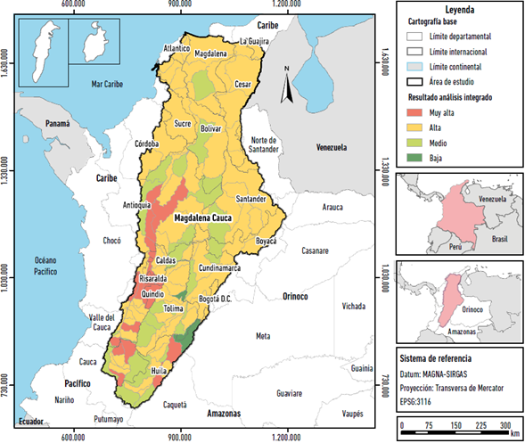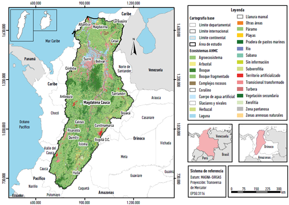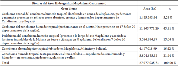 El AHMC es considerada como una de las 5 áreas establecidas en la zonificación y codificación hidrográfica de Colombia (Guzmán, Ruiz y Cadena 2014), con un área de 271.118 km2 es la tercer macrocuenca más grande en tamaño después de las del Orinoco y Amazonia7. Se constituye en el territorio más complejo de la Nación en términos de biodiversidad ecosistémica, antrópica, cultural y económica (Rodríguez y Armenteras 2006). Se caracteriza por contar con 5 tipos de biomas en su territorio, los cuales se han podido diversificar debido a la variedad de climas, relieves, topografías y suelos presentes en la región y se muestra su área y características en la Tabla 1.