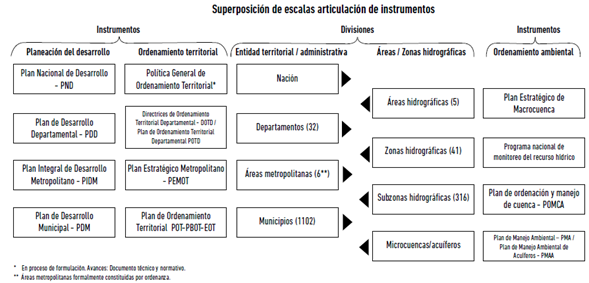 Como se muestra en la Figura 10, los instrumentos de ordenamiento territorial y de planeación del desarrollo se formulan en la misma escala, es decir, para la Nación, los departamentos, las áreas metropolitanas formalmente constituidas y los municipios; pero los instrumentos ambientales no, ellos están basados en unas unidades espaciales conforme a la zonificación hidrográfica (área, zona y subzona hidrográficas). Al comparar el ámbito espacial de las entidades territoriales y de la zonificación ambiental, se encuentra que sus límites no coinciden; por lo que más allá de ser un problema, es un reto para que las instituciones competentes encargadas de implementar los instrumentos anteriormente nombrados se coordinen.
