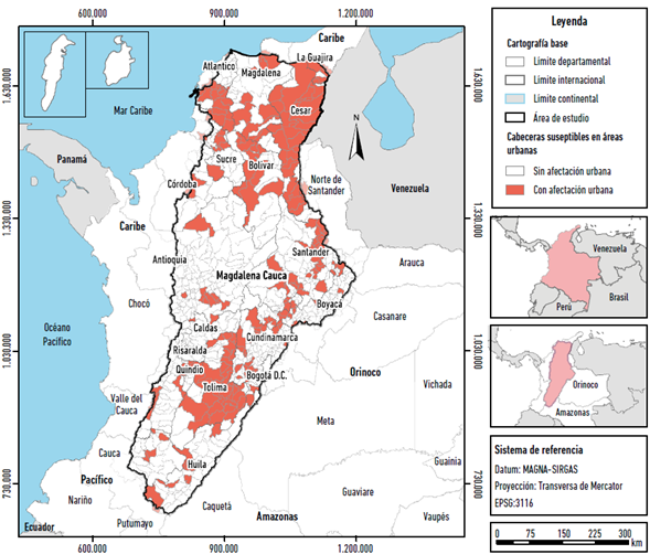 De las 391 cabeceras priorizadas por su susceptibilidad al desabastecimiento hídrico en Colombia, 308 (78,8 %) se encuentran localizadas en el AHMC. Las causas de los problemas de desabastecimiento (reducción de caudales, déficit de precipitación y/o deficiencia de infraestructura) tienen área de afectación urbana en 212 cabeceras municipales del AHMC, de las cuales, solo 24 pertenecen al sistema de ciudades. Así las cosas, la susceptibilidad al desabastecimiento hídrico en el sistema de ciudades del AHMC se focaliza en 24 cabeceras municipales, que representa algo más del 11 % de las cabeceras, donde habita el 11,2 % de la población urbana de dicha AH. En contraste, 188 cabeceras que no hacen parte del sistema de ciudades representan casi el 89 % de las cabeceras del AHMC, en las que habitan 2.243.178 habitantes. De esta manera, puede concluirse que la susceptibilidad al desabastecimiento hídrico se focaliza en unas pocas cabeceras del sistema de ciudades y en la mayor parte de pequeñas cabeceras municipales del AHMC, que no hacen parte del sistema de ciudades de Colombia.