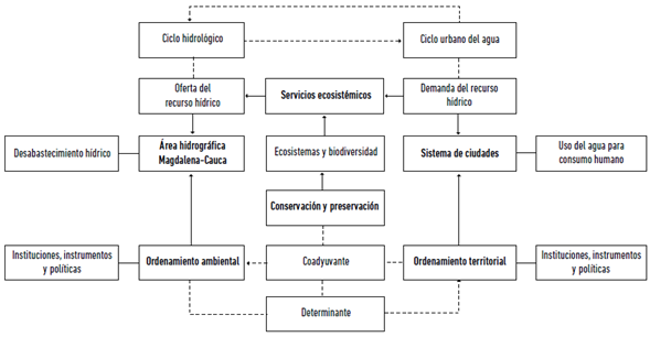 El proyecto de investigación partió del marco conceptual desarrollado en la Evaluación de Ecosistemas del Milenio (Reid et ál. 2005), orientado a entender las relaciones entre los ecosistemas y los beneficios que prestan a la humanidad para su bienestar, como aprovisionamiento, regulación y apoyo, así como sus servicios culturales (Sachs 2015, 526). Los servicios ecosistémicos son los beneficios directos e indirectos que la humanidad recibe de la biodiversidad y que son resultado de la interacción entre los diferentes componentes, estructuras y funciones que constituyen la biodiversidad (MADS 2012). Uno de los servicios eco-sistémicos es el aprovisionamiento hídrico, que permite el desarrollo del sistema de ciudades y la satisfacción de la demanda de agua para el consumo humano; además, propicia una visión integradora del ciclo hidrológico con el ciclo urbano del agua. En tal visión integradora, el ciclo urbano del agua, que comprende el abastecimiento (captación, potabilización, almacenamiento y distribución), el saneamiento (recolección a través del alcantarillado, depuración o vertido) y la reutilización (regeneración y transporte) del agua en la ciudad (AQUAE Fundación 2019), aparece integrado dentro del ciclo hidrológico, definido como el "movimiento general del agua, ascendente por evaporación y descendente primero por las precipitaciones y después en forma de escorrentías superficial y subterránea" (Sánchez San Román 2017, 2).