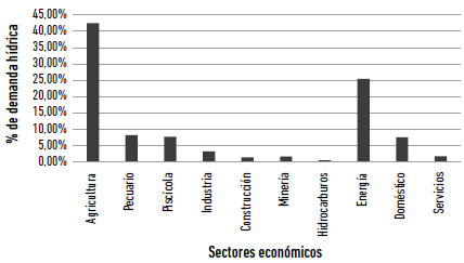 En el sector de energía las SZH del río Sogamoso y Nare representan cada una más de un 8 % de la demanda hídrica del sector. En el sector industrial se encuentran las SZH de los ríos Porce, Bogotá y Lebrija, que representan el 34,4 % de la demanda de agua para la industria en la Nación. En la construcción las SZH del río Cauca entre San Juan y Puerto Valdivia representan un 37 % de la demanda hídrica, río Páez 10,7 %, y Porce casi un 8 %. Para el sector servicios se encuentra que la SZH río Bogotá demanda el 14,74 % de agua, y le siguen las SZH Chicamocha, Sumapaz y río Negro, que suman el 25,1 % de la demanda. De igual manera, las SZH donde se ubica la mayor cantidad de población, son las que más demandan agua para uso doméstico; es así como las SZH río Bogotá, Porce y Lili-Meléndez Cañaveralejo suman un 28 % de la demanda de este sector (IDEAM 2019). Estas cifras también las ratifica el MAVDT al sostener que la mayor demanda hídrica para uso doméstico e industrial está en las ciudades de Bogotá, Cali, Medellín y Barranquilla y la mayor cantidad de captaciones en el país se realiza a lo largo del valle del AHMC. Por ejemplo, dada la alta demanda hídrica sobre la sabana de Bogotá, actualmente se hace transvase de cuencas del Área Hidrográfica de la Orinoquía (MAVDT 2010).