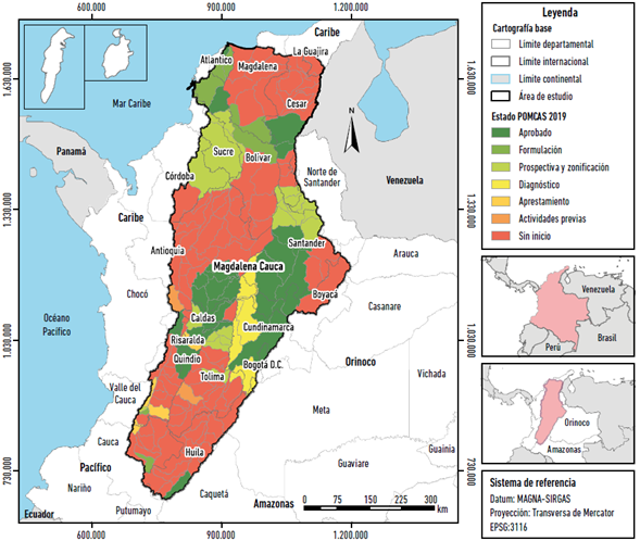En el país solamente el 9,6 % de los Pomca estaban aprobados a mayo de 2019, mientras que el 72,8 % se encontraba sin inicio y el 17,5 % estaba fases intermedias, es decir, en proceso de elaboración como lo evidencia la Tabla 4. El AHMC es la que mejor balance tiene respecto de las demás áreas hidrográficas, cuenta con el mayor número de Pomca elaborados (25) que corresponde al 16,1 % del total para su área de jurisdicción, el 19,4 % está en proceso y el 64,5 % no ha iniciado aún. En la Figura 9 se pueden observar el AHMC y la localización de los Pomca por estado. Por otro lado, para el AH del Amazonas, ningún Pomca se encontraba aprobado a la fecha.