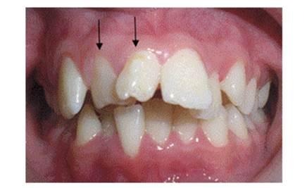 Figure 1 Front view. The arrows point to the supernumerary teeth; note that these are two supplemental dysmorphic teeth