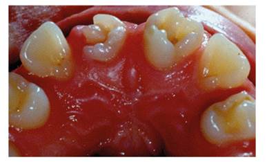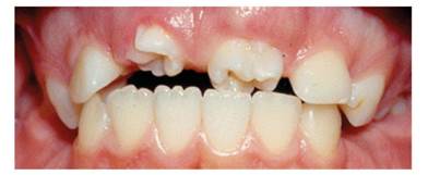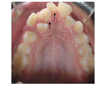 Figure 7 shows the front view of a 9-year-old male patient consulting the Clínica Integral del Niño y del Adolescente of Universidad del Valle School of Dentistry, with two conical-shaped mesiodens that have displaced the central and lateral incisors distally.