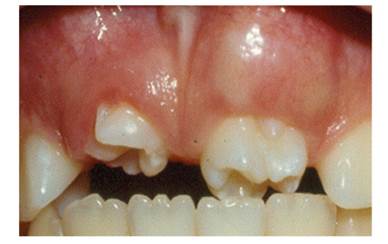 The patient had two mesiodens that have signifi cantly displaced the central incisors and lateral incisors. The mesiodens have the shape of incisors with multiple tubercles.