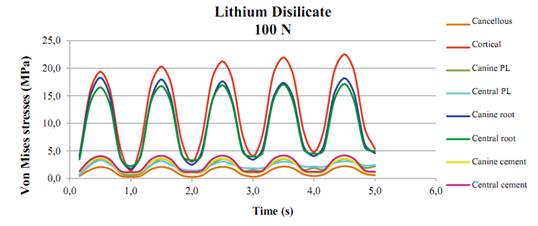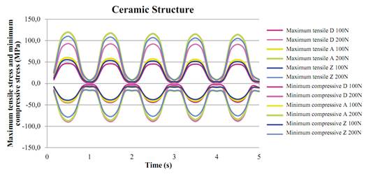 four models of fixed partial dentures (FPD) were designed, representing alumina, zirconia, and metal-ceramic two-layered systems and a lithium disilicate monolithic system, with a 9 mm2 connector. The variables included were elastic modulus, Poisson’s ratio, and ultimate tensile strength. A static load of 100 N was applied up to 800 N, as well as a dynamic load of 100 and 200 N, calculating von Mises stress and maximum and minimum principal stresses.